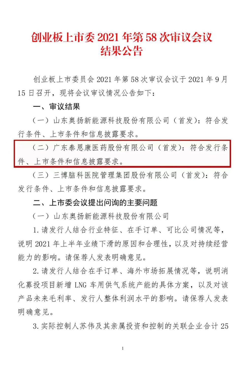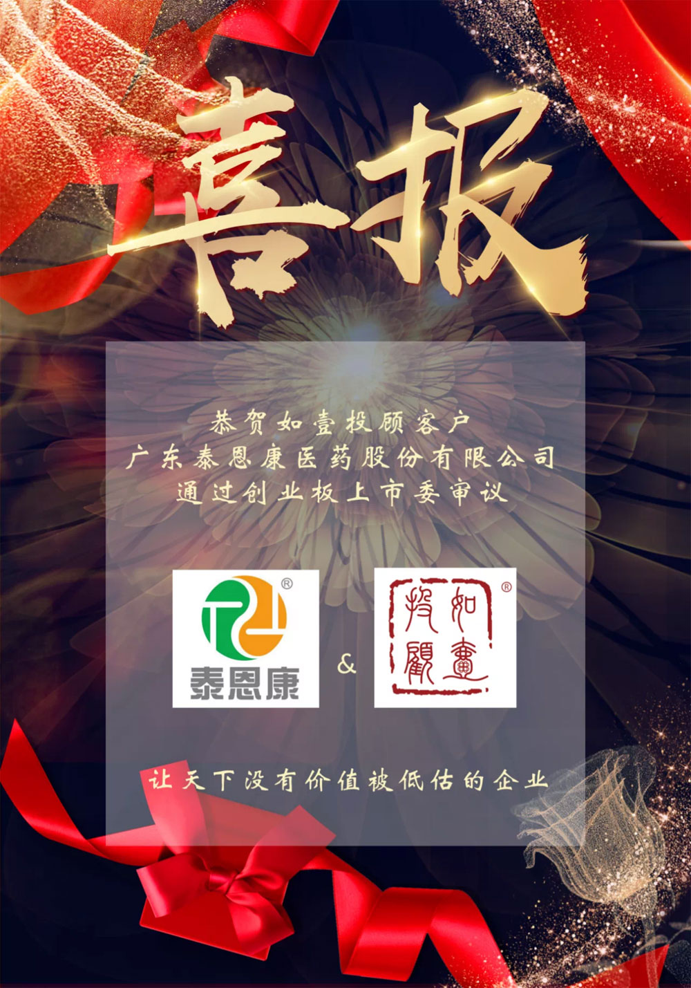 热烈恭贺如壹公司旗下如壹投资顾问客户 “广东泰恩康医药股份有限公司” (泰恩康,831173)于2021年09月15日成功通过创业板上市委2021年第58次审议会议。经审议,泰恩康符合创业板发行条件、上市条件和信息披露要求。